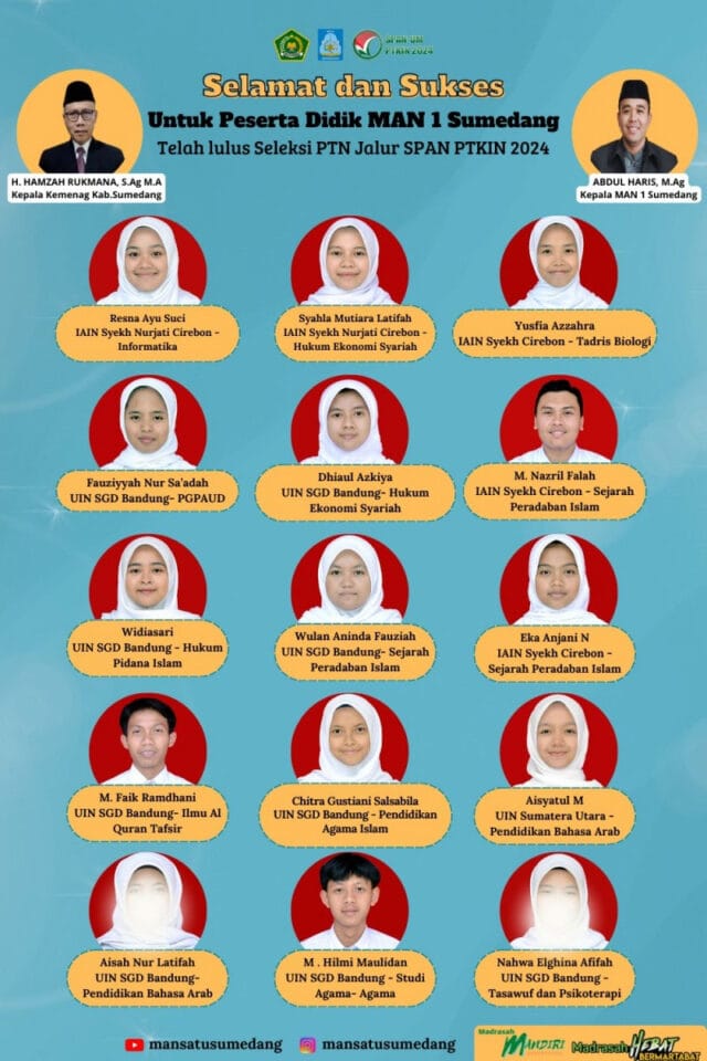 “Selamat dan sukses untuk 15 peserta didik MAN 1 Sumedang yang berhasil melangkah ke jenjang pendidikan yang lebih tinggi. Semoga keberhasilan ini menjadi awal dari perjalanan pendidikan yang gemilang dan bermanfaat bagi bangsa dan negara,” pungkasnya.