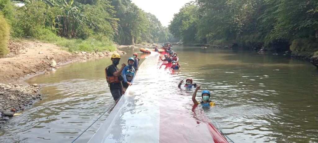 Modusinvestigasi.Online, Bogor – Komunitas Peduli Ciliwung (KPC) bersama Satgas Naturalisasi Sungai Ciliwung Kota Bogor, Badan Penanggulangan Bencana Daerah (BPBD), komunitas pegiat alam Genk Rass Fams (GRF) dan warga sekitar melakukan aksi di peringatan hari kemerdekaan RI ke 76, dengan membentangkan bendera merah putih sepanjang 33 meter x 1,5 meter di aliran Sungai Ciliwung, Kelurahan Cibuluh, Kecamatan Bogor Utara, Kota Bogor, Selasa (17/8/2021).