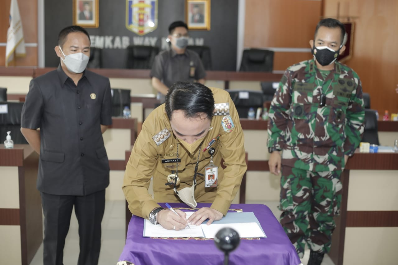 Bupati Raden Adipati Surya menghadiri Rapat Evaluasi Hasil Monitoring dan Evaluasi PPKM Mikro dan Penandatangan Kesepakatan Bersama untuk Penegakan Protokol Kesehatan (Prokes) di Kabupaten Way Kanan.
