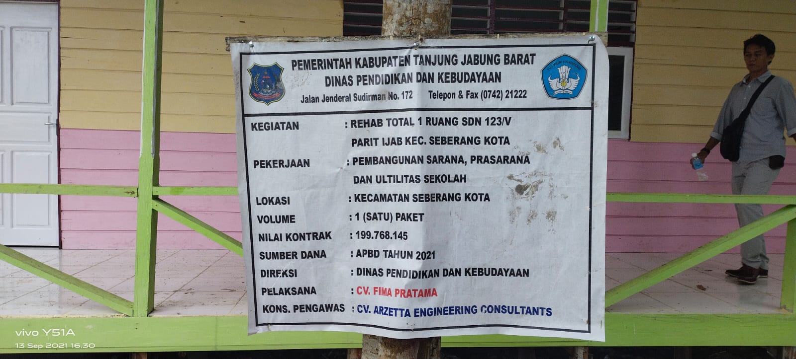 Seperti hal nya terjadi di Kabupaten Tanjung Jabung Barat Kecamatan Seberang Kota Desa Pulai Raya Parit ijab SD 123/V Parit ijab, yang mendapatkan Rehap Total satu Ruangan SD Anggaran APBD Tahun 2021 dengan Nilai 199.768.145; yang di Kerjakan CV. FIMA PRATAMA dan Consultan Pengawas CV.ARZETTA ENGINEERING CONSULTANTS, sangat di sayangkan.