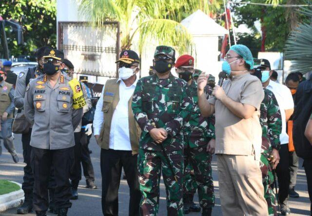 Modusinvestigasi.online | Semarang – Dalam tindak lanjut perkembangan lonjakan kasus Covid-19 di wilayah Jawa Tengah, Panglima TNI Marsekal TNI Dr. (H.C.) Hadi Tjahjanto, S.I.P. , didampingi oleh Kepala Badan Pemeliharaan Keamanan (Kabaharkam) Polri Komjen. Pol. Drs. Arief Sulistyanto, M.Si. serta Kepala BNPB Letjen TNI Ganip Warsito, S.E., M.M. melaksanakan pemantauan pasien isolasi terpusat yang berlokasi di Rumah Dinas Walikota Semarang, Jl. Abdul Rahman Saleh, Kalipancur Kec. Ngaliyan Semarang. Minggu (25/07/2021).