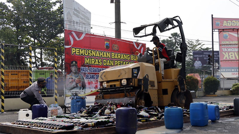 Pemusnahan miras dilakukan dengan dihancurkan menggunakan kendaraan berat. Sedangkan petasan dimusnahkan dengan cara direndam dalam air hingga menghilangkan potensi ledakan. (Bidhumas)