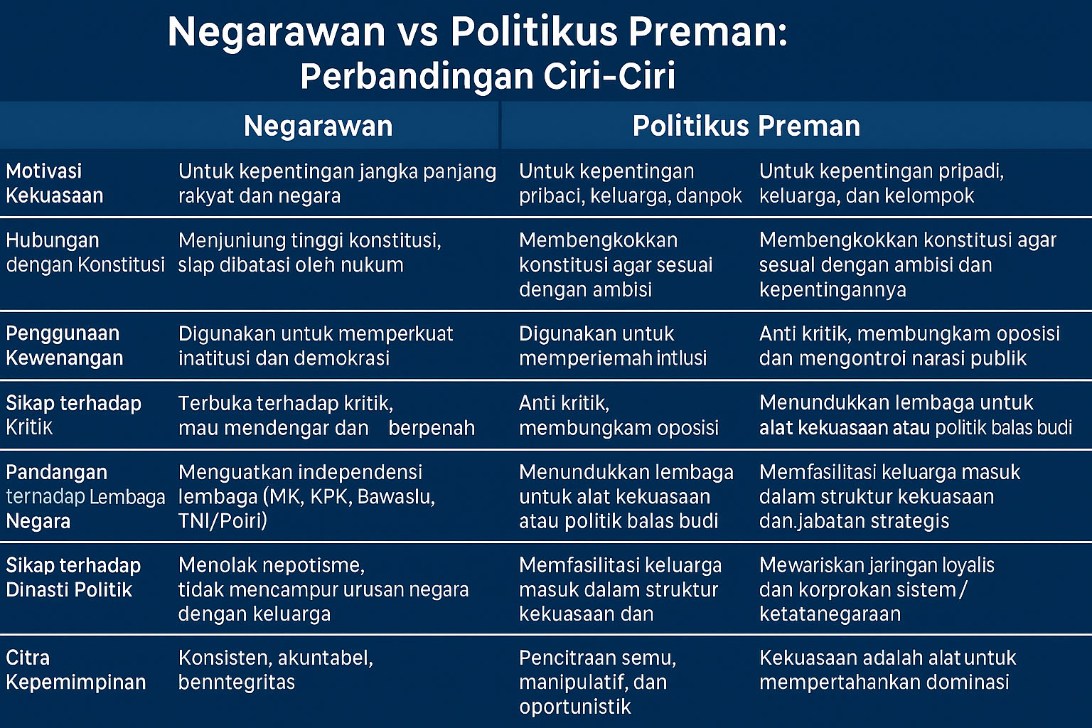 Seorang negarawan memperkuat institusi. Seorang politikus preman menundukkan institusi untuk jaringannya.