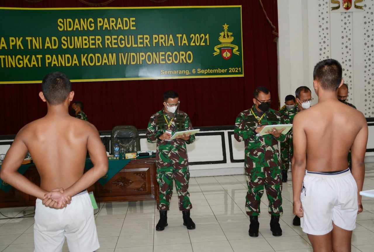 Modusinvestigasi.online, Semarang – Pangdam IV/Diponegoro Mayjen TNI Rudianto memimpin pelaksanaan Sidang Parade Penerimaan Calon Bintara PK TNI AD Sumber Reguler Pria TA 2021 Tingkat Panda IV/Diponegoro bertempat di Balai Diponegoro, Jl. Perintis Kemerdekaan, Watugong. (06/09/2021).