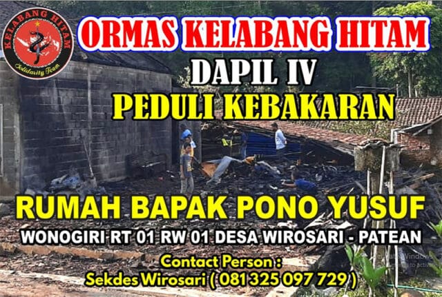 Kab. Kendal Jawa Tengah (Pelitaindo.news) – Sebagai bentuk kepedulian terhadap sesama dan lingkungan, ormas Kelabang Hitam Dapil IV yang dipimpin oleh ketua nya Purwoko dan Humasnya Jumari mengajak kepada seluruh anggota nya, juga kepada para donatur dari mitra kerja serta berbagai lapisan masyarakat untuk peduli terhadap sesama dalam rangka penggalangan dana bagi korban kebakaran a/n Pono Yusuf alamat Wonogiri RT 01 RW 01 Ds. Wirosari Patean Kab. Kendal Jawa Tengah.