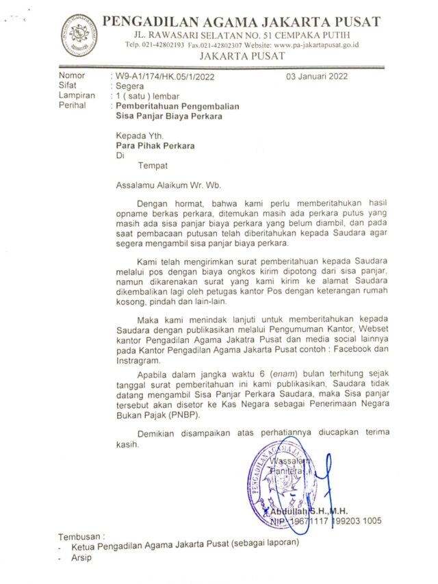 - Diambil oleh kuasa keluarga (Insidentil). Membawa surat kuasa, yang didalamnya menyebut secara jelas untuk pengambilan salinan putusan/penetapan dengan menyebutkan nomor perkara, dan Fotocopy identitas Pemberi Kuasa dan Penerima Kuasa.