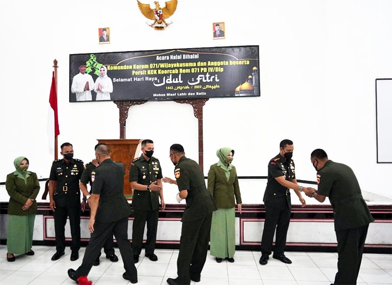 Halal Bihalal dipimpin langsung oleh Danrem 071/Wijayakusuma Kolonel Inf Yudha Airlangga, S.E., diikuti seluruh prajurit dan PNS Makorem 071/Wijayakusuma serta turut hadir Ketua Persit Kartika Chandra Kirana Koorcab Rem 071 PD IV/Diponegoro Ny. Natania Yudha Airlangga, Wakil Ketua Persit Kartika Chandra Kirana beserta pengurus.