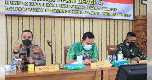 Sosialisasi Perpanjangan PPKM Level 4 serta Musyawarah Untuk Solusi Dan Penyerahan Secara Simbolis Bantuan Sosial Kepada Paguyuban Pedagang Kali Lima Di Wilayah Kabupaten Blora.