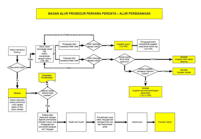 - Apabila kedua belah pihak lengkap maka diberi kesempatan untuk menyelesaikan dengan perkara secara damai (melalui mediasi);